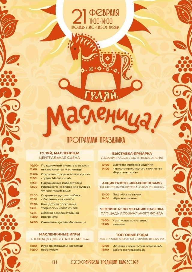 21 февраля площадь у ледового дворца «Глазов Арена» превратится в центр ярких гуляний - Глазов встретит Масленицу!